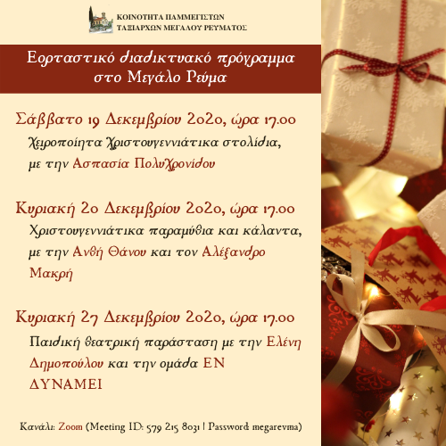 Η Κοινότητα του Μεγάλου Ρεύματος αγαπά τον Άνθρωπο και στηρίζει τον Πολιτισμό. Αυτή την χρονιά, η υγειονομική κρίση που μαστίζει την υφήλιο, σχεδόν απαγορεύει, μεταξύ άλλων την ανθρώπινη επικοινωνία μέσω της επαφής, της αγκαλιάς, ή της κοντινής συναναστροφής. Αντιδρώντας στην πρωτόγνωρη αυτή κατάσταση, η Εφοροεπιτροπή της οικείας Κοινότητας φέρνει την χαρά των εορτών στον χώρο σας, ώστε κανείς μικρός ή μεγαλύτερος να μην αισθανθεί θλίψη και μοναξιά. Μία σειρά από διαδικτυακές εκδηλώσεις και εργαστήρια, θα σας κρατήσουν συντροφιά, θα σας ψυχαγωγήσουν και θα γεμίσουν δημιουργικά τον χρόνο σας.