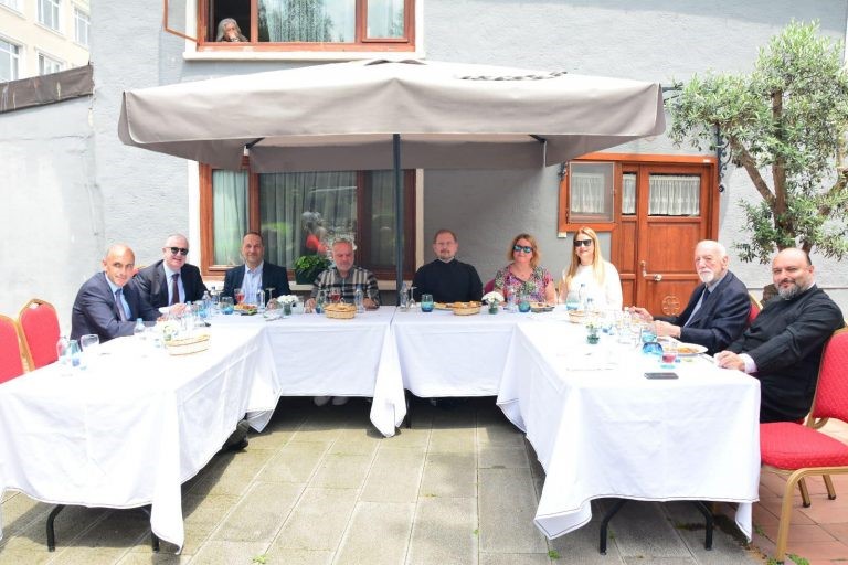 Μετά τη λήψη αναμνηστικής φωτογραφίας, κατευθυνθήκαμε όλοι στον αυλόγυρο του Ναού μας, όπου παρατέθηκε γεύμα, προς τιμήν των φιλοξενουμένων μας, το οποίο ευλόγησε ο Σεβ. Αρχιερατικώς Προϊστάμενος του Σταυροδρομίου.